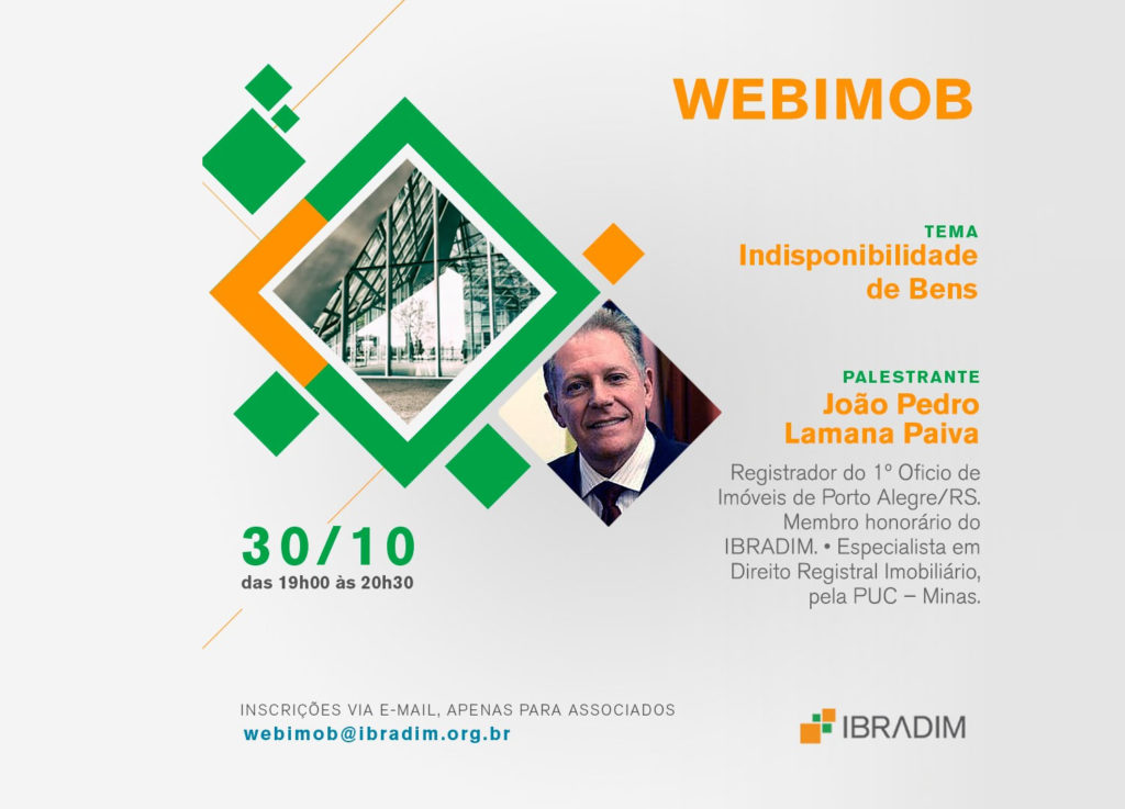 O tema do nosso próximo WEBIMOB é Indisponibilidade de Bens! Teremos a honra de contar com João Pedro Lamana Paiva, Registrador do1° Oficio de Imóveis de Porto Alegre/RS e membro honorário do IBRADIM. Anote na agenda! Dia 30/10, 3ª feira, das 19h00 às 20:30h. Evento exclusivo para associados. Para se inscrever, envie e-mail para webimob@ibradim.org.br informando: nome do […]