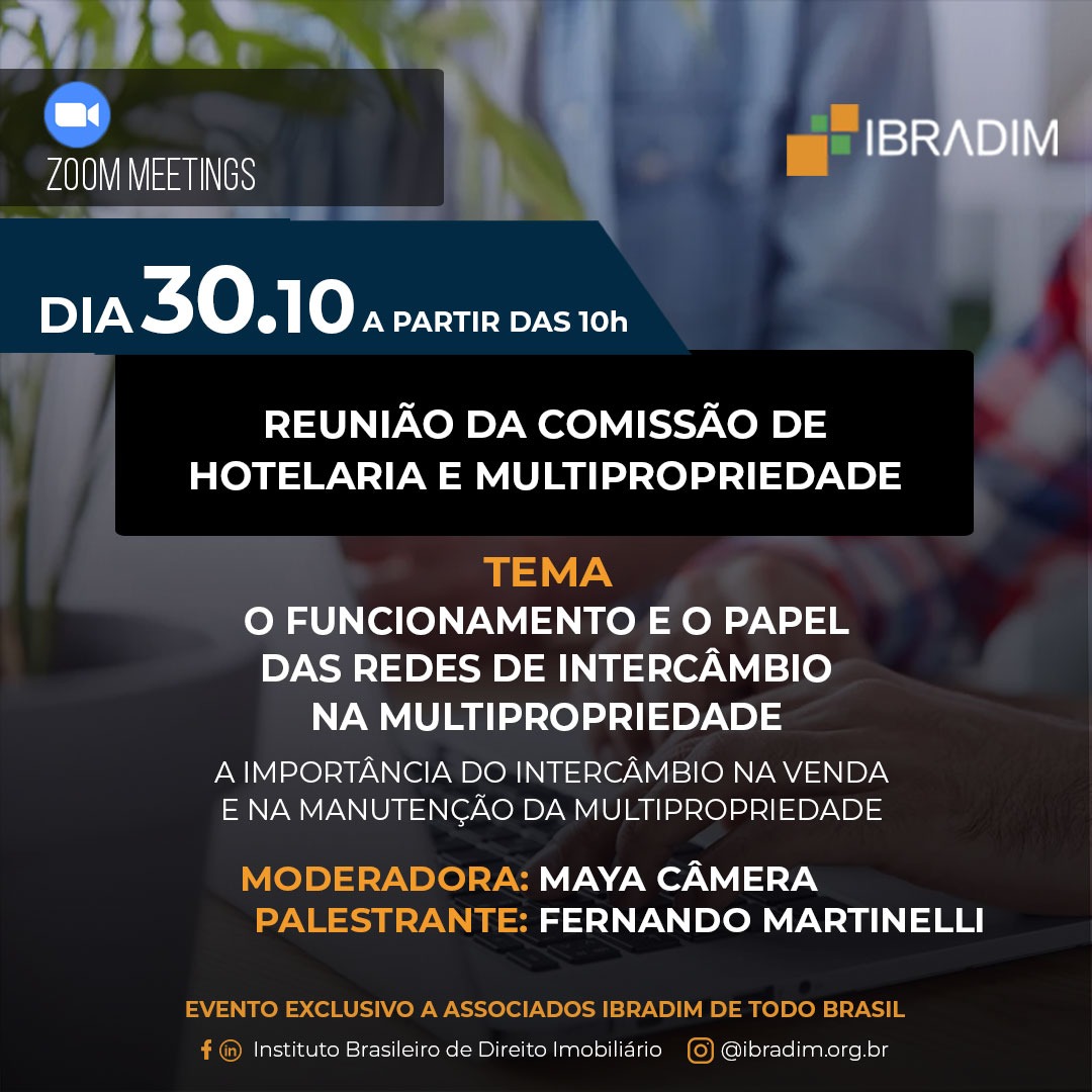 No dia 30 de outubro, a Reunião da Comissão de Hotelaria e Multipropriedade aborda o tema “Funcionamento e o papel das redes de intercâmbio na multipropriedade”.